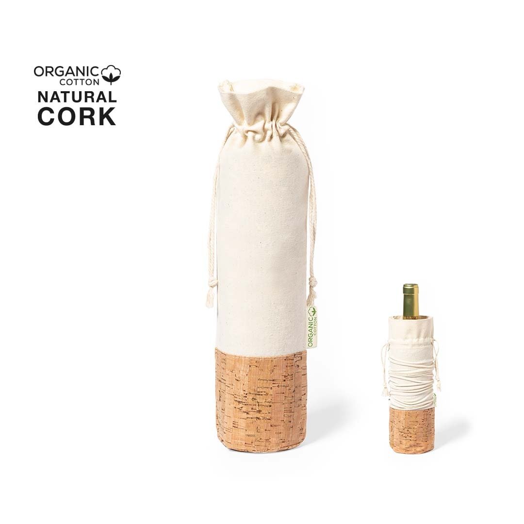 Bolsa para botellas de línea nature. Fabricada en algodón orgánico 100%, con cierre de cordón y base en corcho natural. Ideal para botellas de 750 ml.