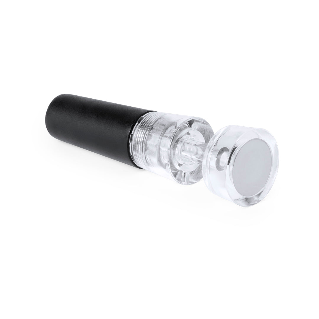 Tapón con bomba de vacío para botellas de vino en elegante diseño de color negro y transparente. Parte superior del tapón metálica para marcaje en láser o tampografía. Presentado en caja individual.