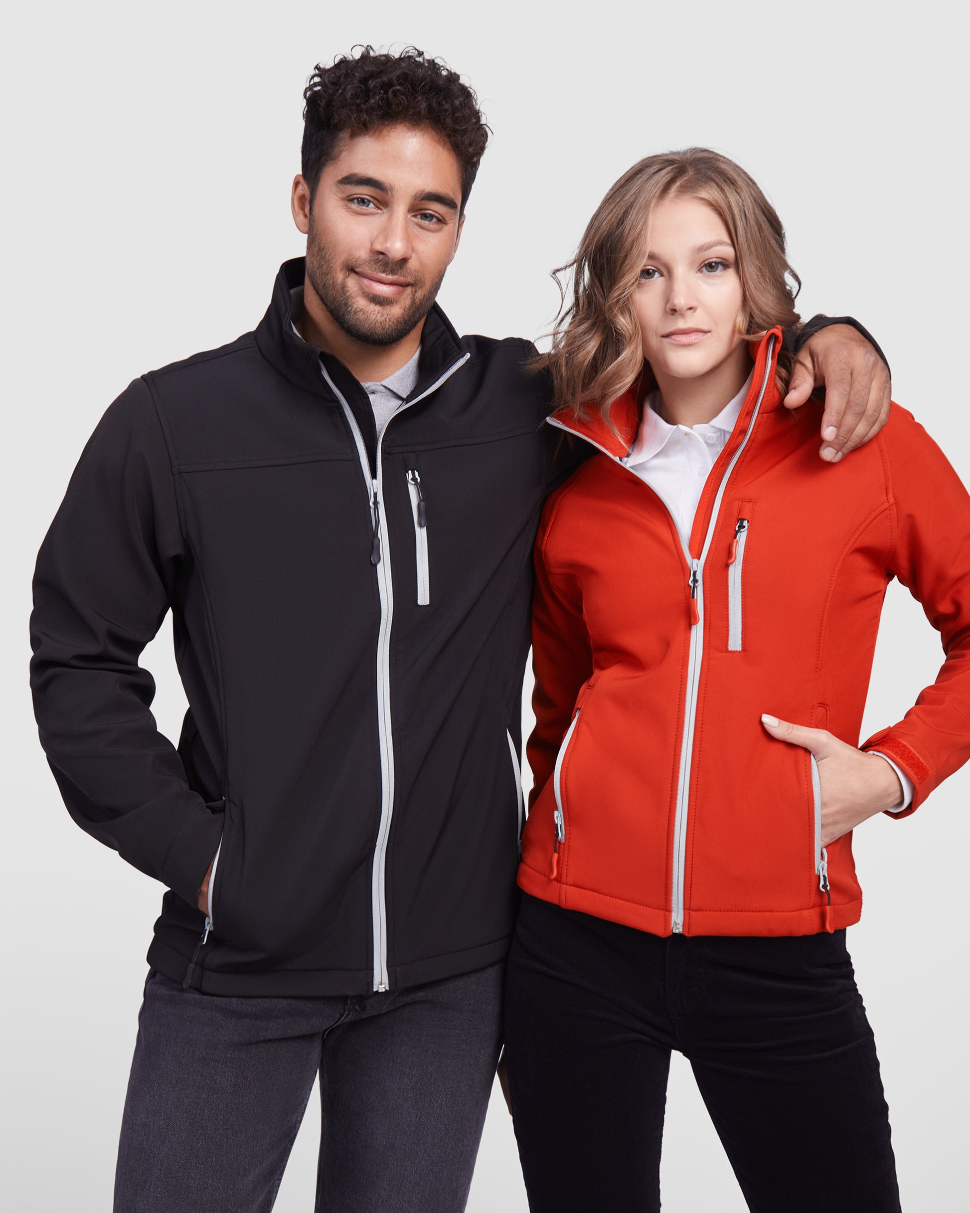 Softshell compuesto por 2 capas, con cremallera invertida efecto sellado, con protector de barbilla combinada y tirador. Corte en pecho (sólo modelo masculino). Cuenta con tres bolsillos exteriores con cremallera combinada con tirador. Ajustadores en puños con velcro. Bajo con cordón elástico y topes.
