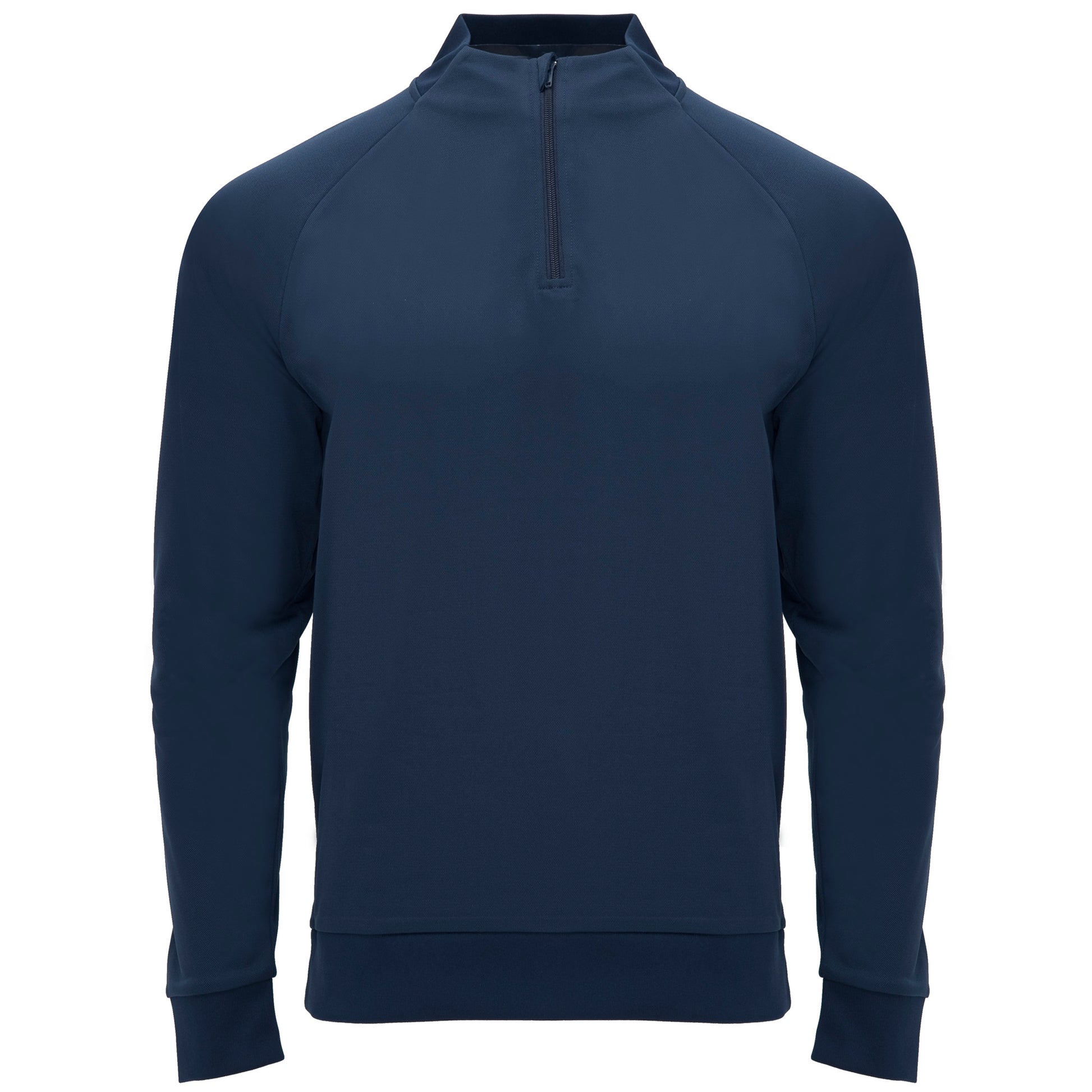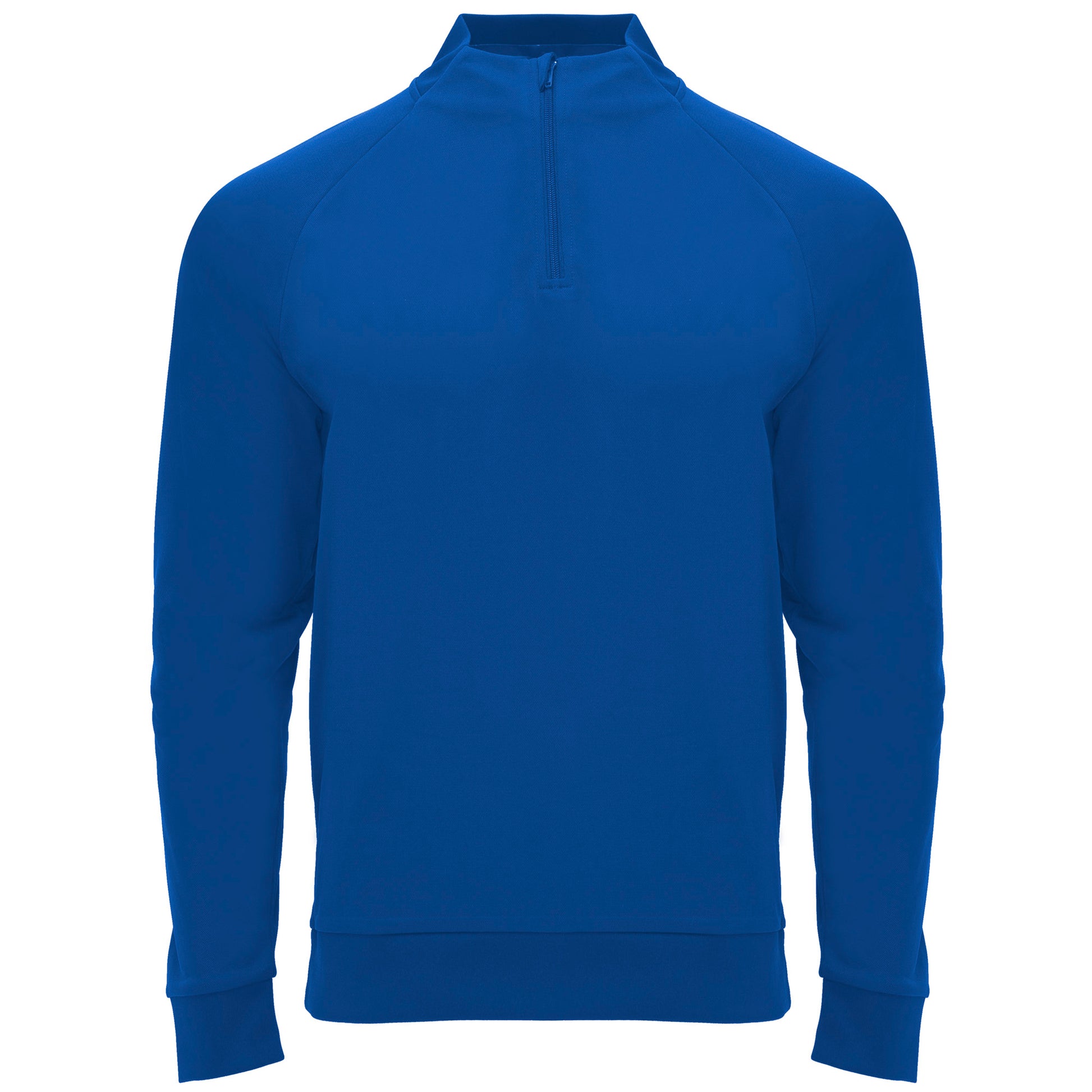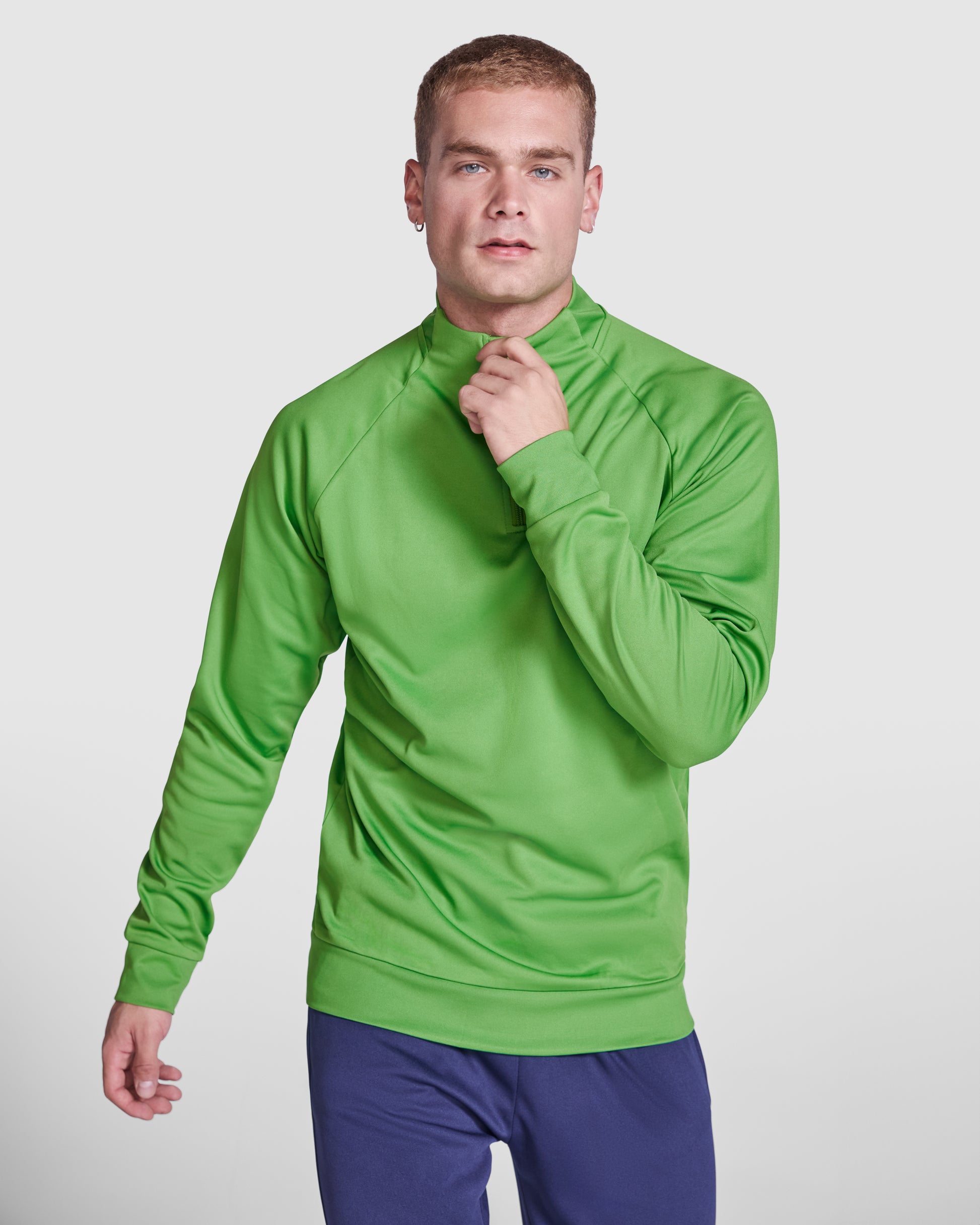 Sudadera de manga ranglán, con Interior perchado, cuello con media cremallera y cubrecosturas de refuerzo en su interior a tono.