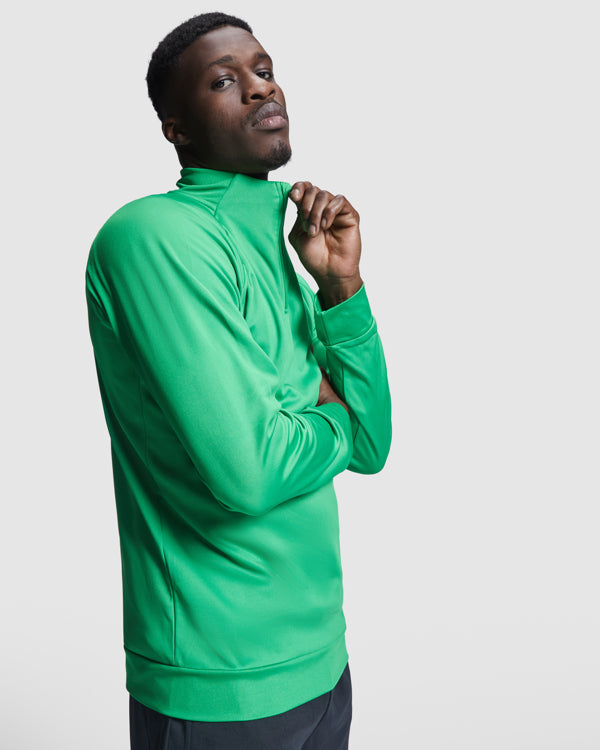 Sudadera de manga ranglán, con Interior perchado, cuello con media cremallera y cubrecosturas de refuerzo en su interior a tono. Parte posterior del cuello, puños y bajo en canalé 1x1.