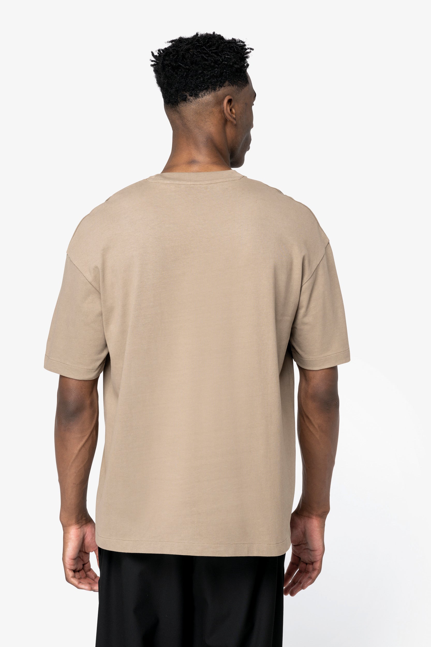 100% algodón orgánico. Algodón cardado. Corte oversize. Costuras laterales. Tacto ligeramente texturizado. Canalé 1 x 1 en el cuello. Tira cubrecosturas del material principal en la parte interior del cuello. Dobladillo con pespunte simple en el bajo de las mangas y el bajo de la prenda.