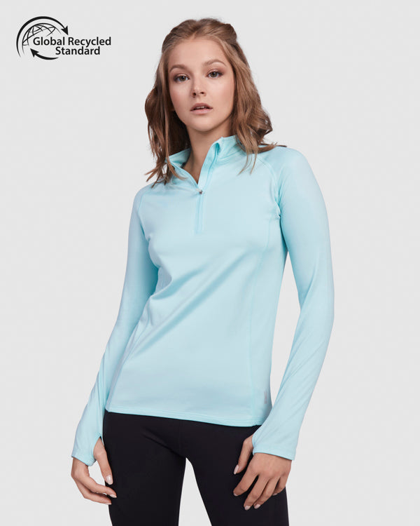 Sudadera técnica de manga larga ranglán para mujer. Interior perchado. Cubrecosturas reforzado en cuello. Media cremallera invertida a tono. Ojales en los puños para el pulgar. Costuras overlock en manga ranglán y paneles laterales. Logo Roly reflectante en panel lateral izquierdo.