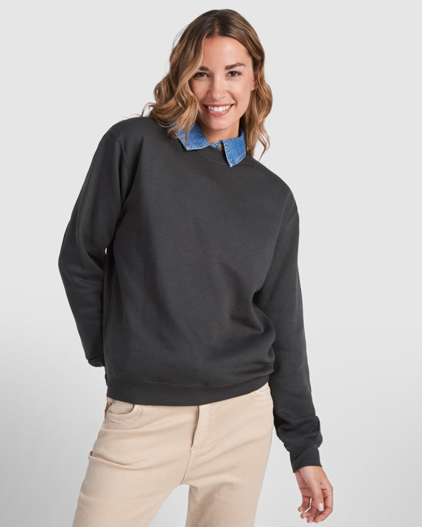 Sudadera en diseño clásico, con cuello, puños y cinturilla de punto canalé 1x1 con elastano. Cubrecosturas reforzado en cuello.