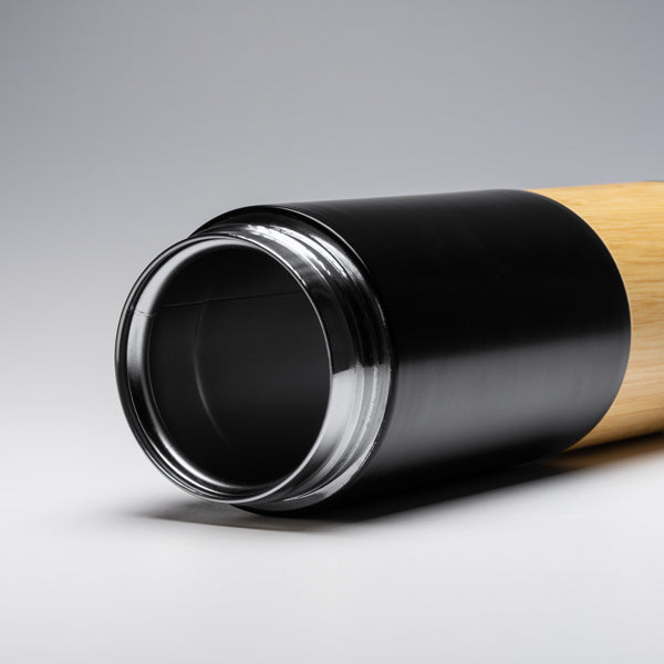 Bidón térmico de acero inoxidable 304 doble pared con detalle en bambú. Idóneo bidón para mantener las bebidas frías y calientes. Tapa con asa función soporte, ideal para smartphone. Capacidad 450 ml.